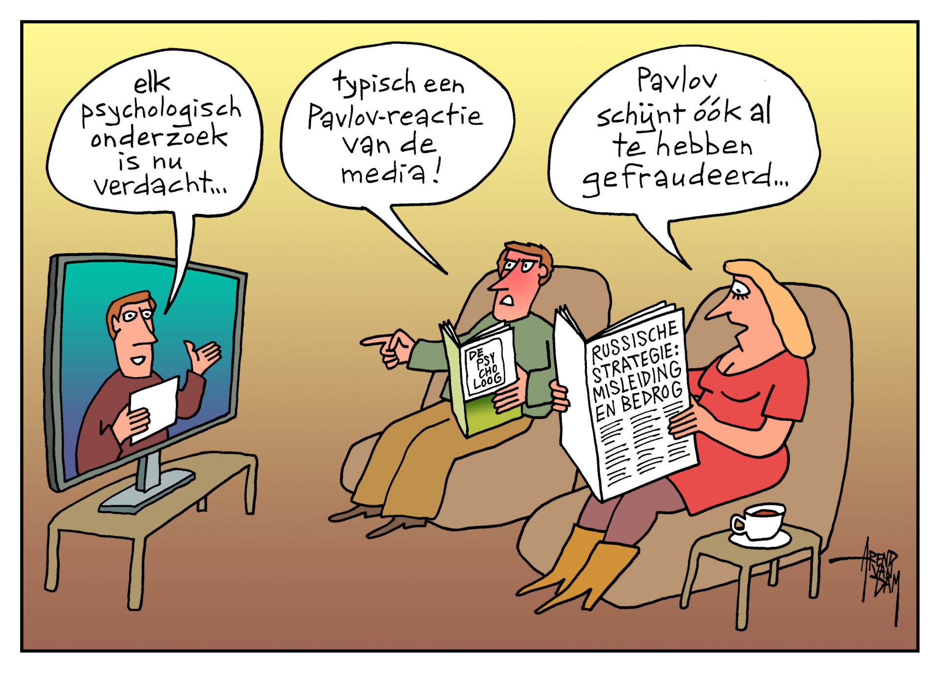 Arend van Dam is cartoonist en maakt “politieke tekeningen” over onderwerpen als: nationale en wereld-politiek, economie, milieu, mensenrechten, samenleving, enz.