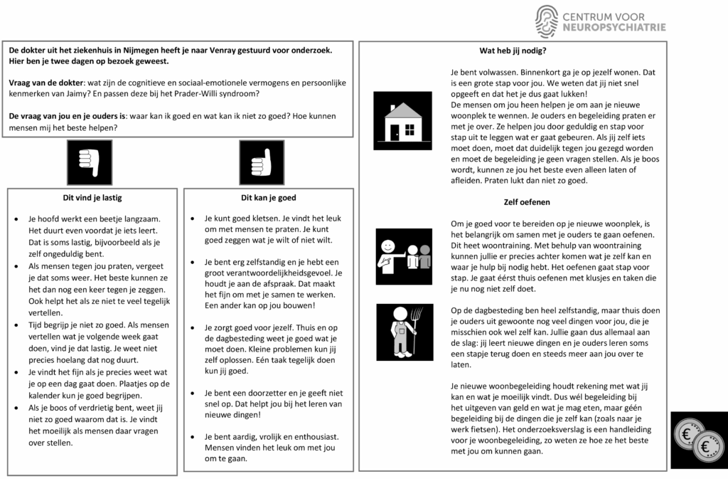 ‘Uit het testonderzoek kwamen enkele opvallendheden naar voren die we graag aan jou voorleggen. Bij mensen met jouw syndroom zien we vaak dat ze moeite hebben om flexibel van de ene naar de andere taak te gaan. Ken jij dit en waar gebeurde het volgens jou? … Wij zagen dat inderdaad een paar keer bij jou gebeuren. Je vindt het moeilijk om bij het oplossen van problemen nieuwe of andere denkstrategieën toe te passen en de bekende denkstrategieën los te laten. Dit herken je, wanneer je het gevoel hebt dat je ergens ‘in blijft hangen’. Dat is enerzijds natuurlijk vervelend, maar anderzijds zagen we dat dit ook in je voordeel kan werken; zo waren je prestaties op een geheugentaak juist opvallend goed, mede door een opvallend gestructureerde denkstrategie.’